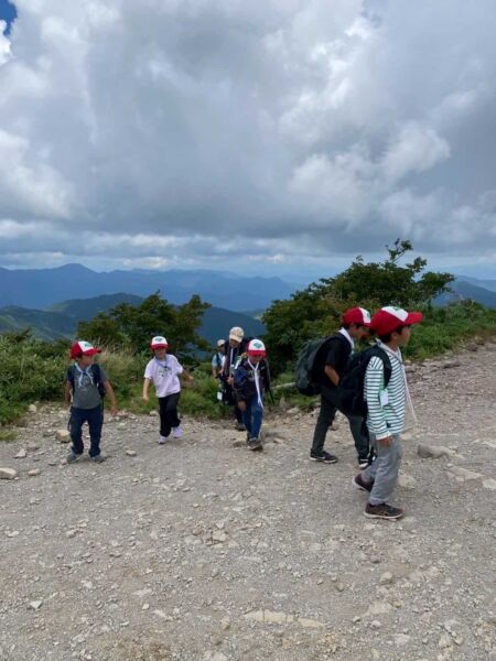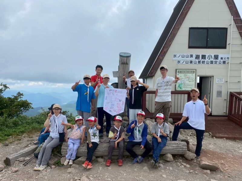 合同行事として、23日(土)早朝7時から、ビーバー隊~ローバー隊・指導者で構成された特別班編成(1班10人から11人)で5班に分かれ、氷ノ山(1510m)登山を実施し、無事登頂しました。その夜はキャンプファイヤーを実施しました。