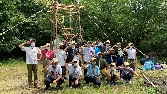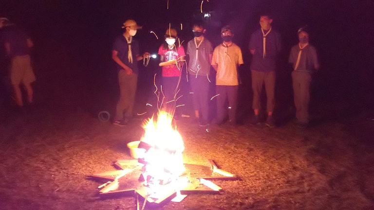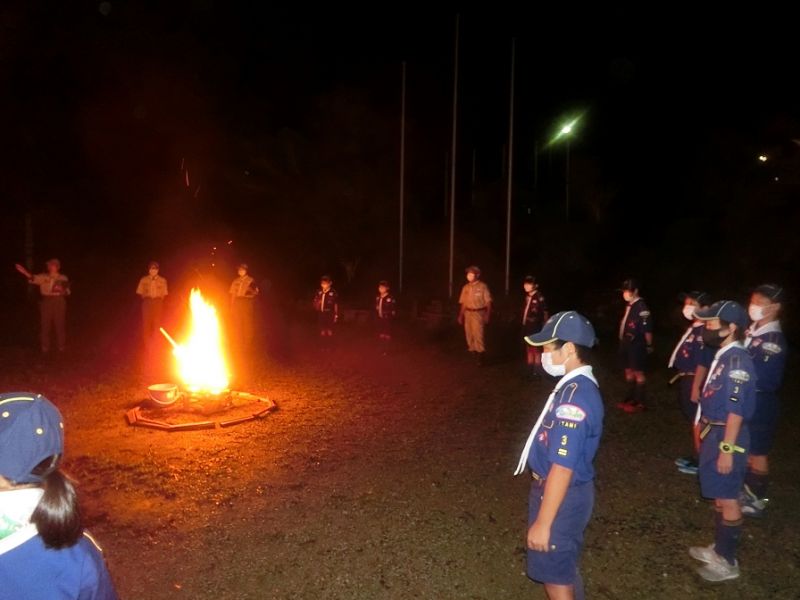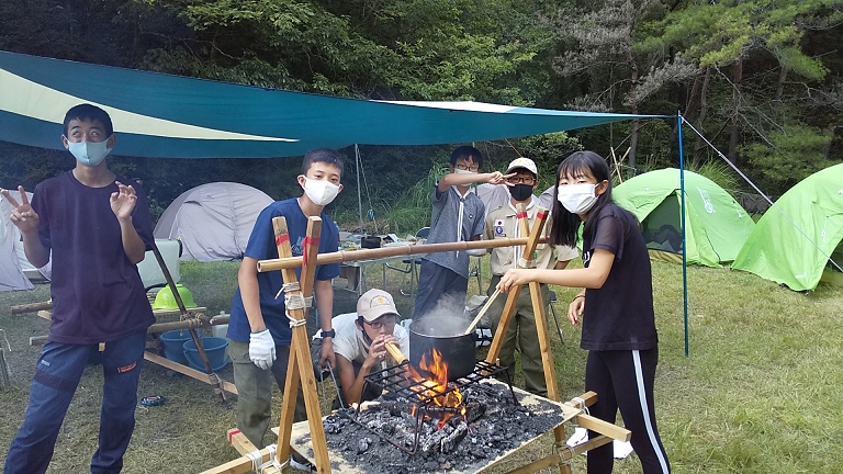 コロナ感染対策の下、事前訓練で準備していた「野外調理、羽束山登山、ファイヤ、スキル訓練など」実施した楽しいキャンプでした。