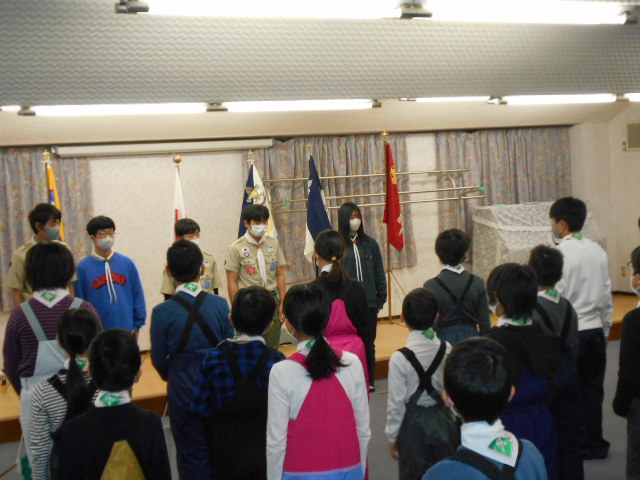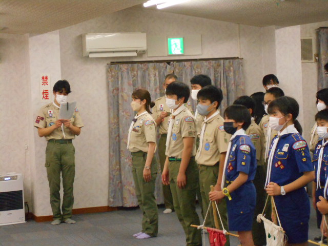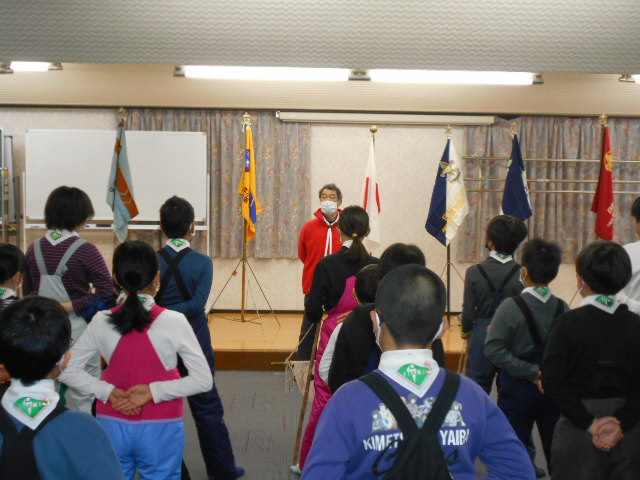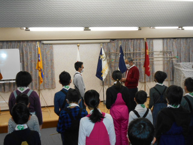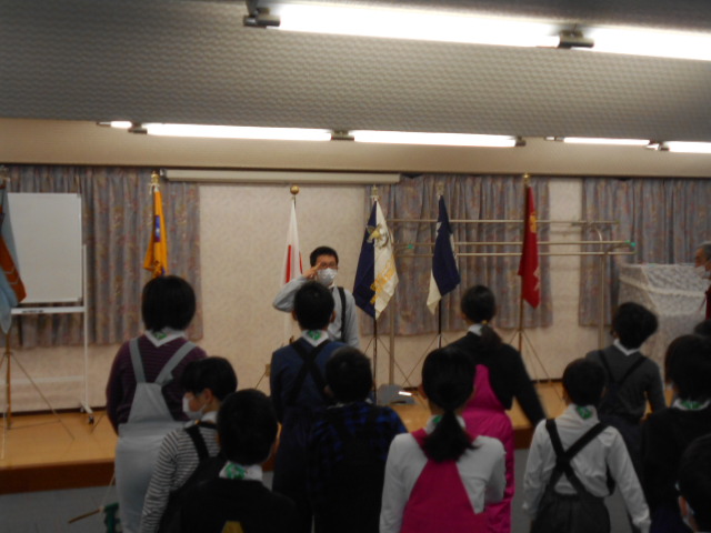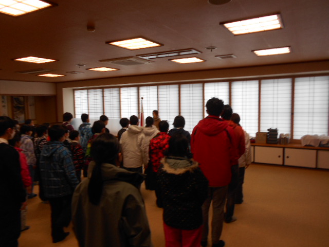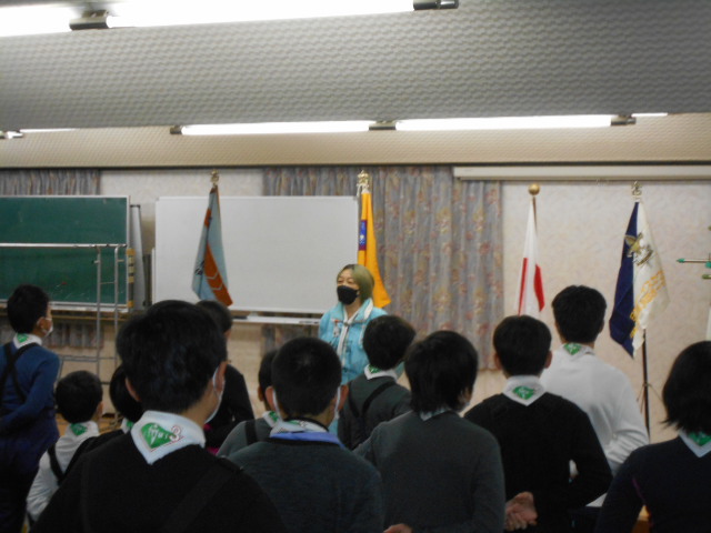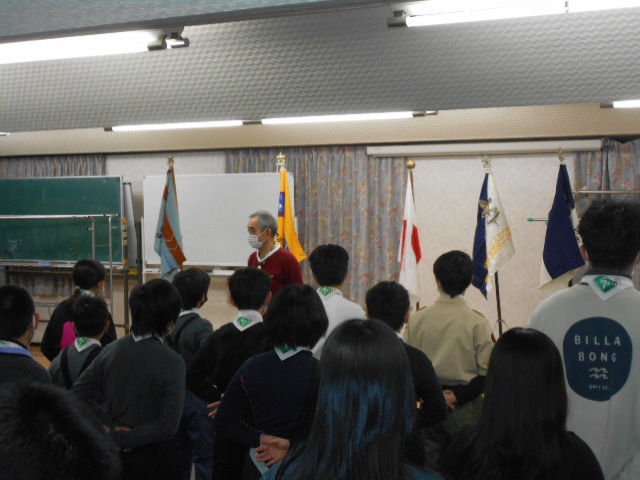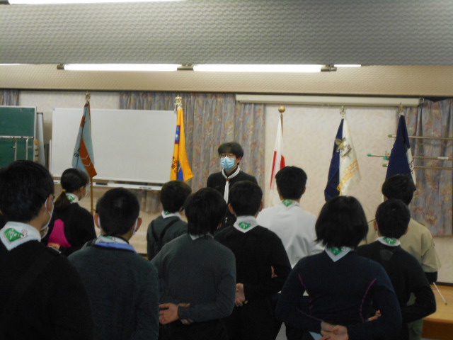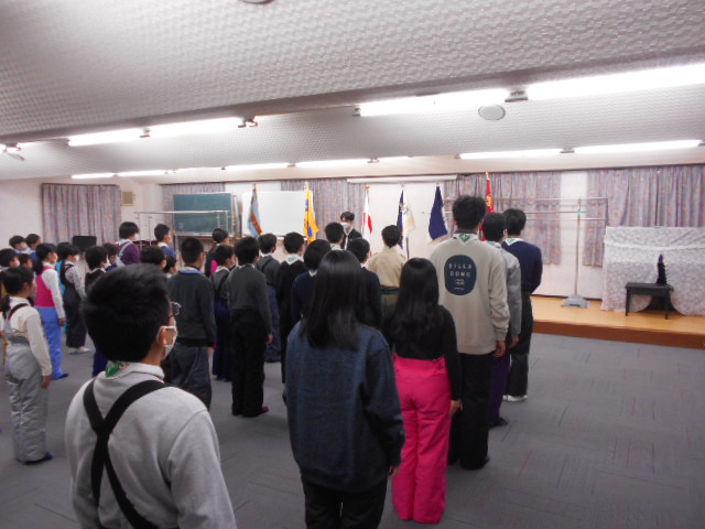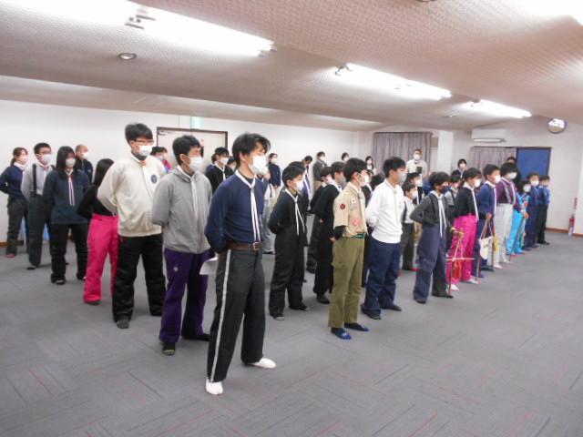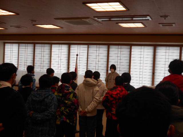 伊丹第3団スキー舎営 2023年2月3日(金)~5日(日) 2月5日(日) 「朝の集い」のようす、2月5日(日)「岡口屋さん退所式」のようす