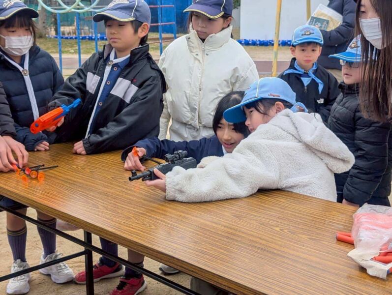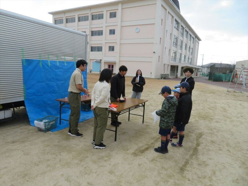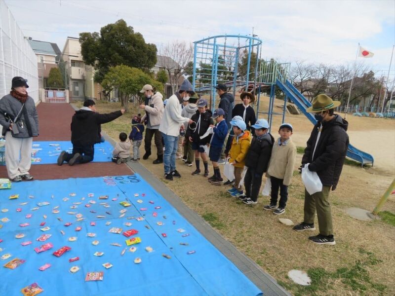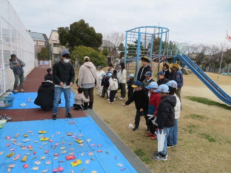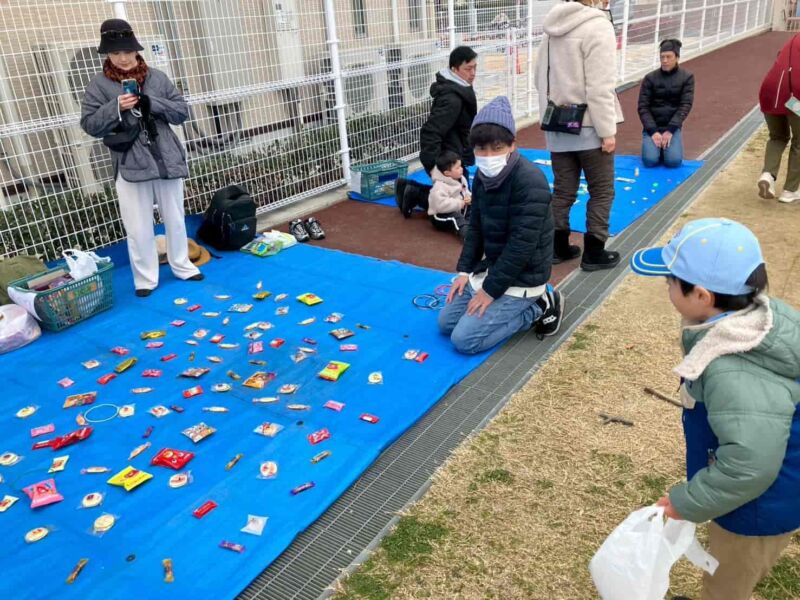 その後、鈴原小学校で「お楽しみゲーム」を行い、たくさんのけいひん(おとしだま)をいただきました。